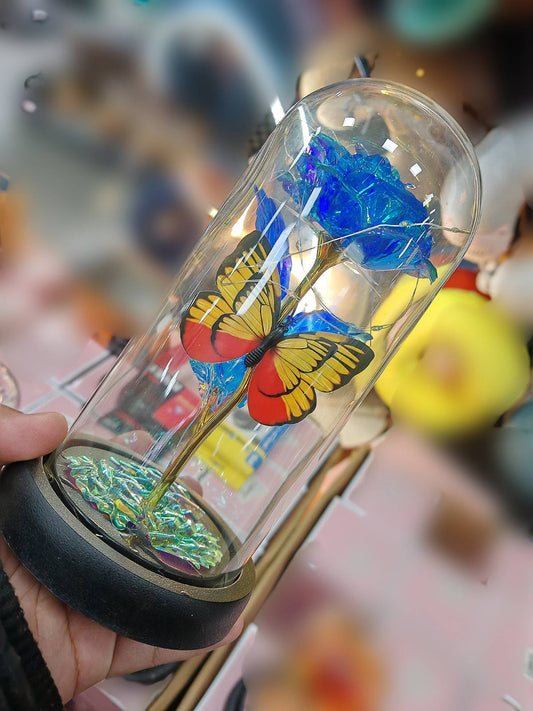 Plava večna ruža u staklenom zvonu sa plavim leptirom