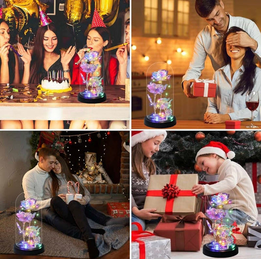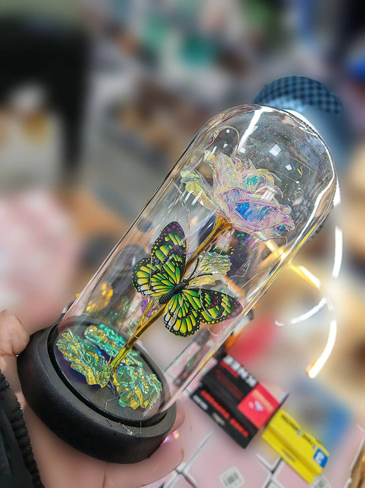 Raznobojna večna ruža u staklenom zvonu sa leptirom