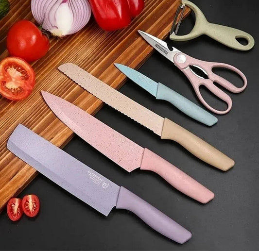 Set čeličnih noževa, makaza i ljuštilice – Raznobojni dizajn