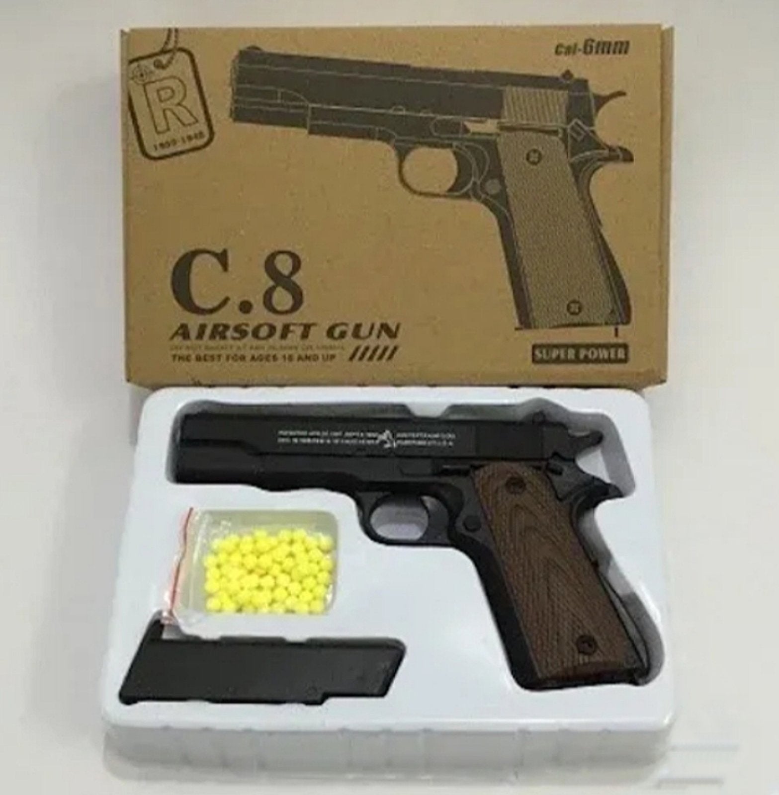 C8 airsoft pištolj izrađen je od punog metala, što mu daje izuzetnu čvrstinu i realističan osećaj u ruci. Zahvaljujući uravnoteženoj konstrukciji i ergonomskom rukohvatu, pogodak je za sve ljubitelje adrenalina, taktičkih igara i rekreativnog gađanja meta.