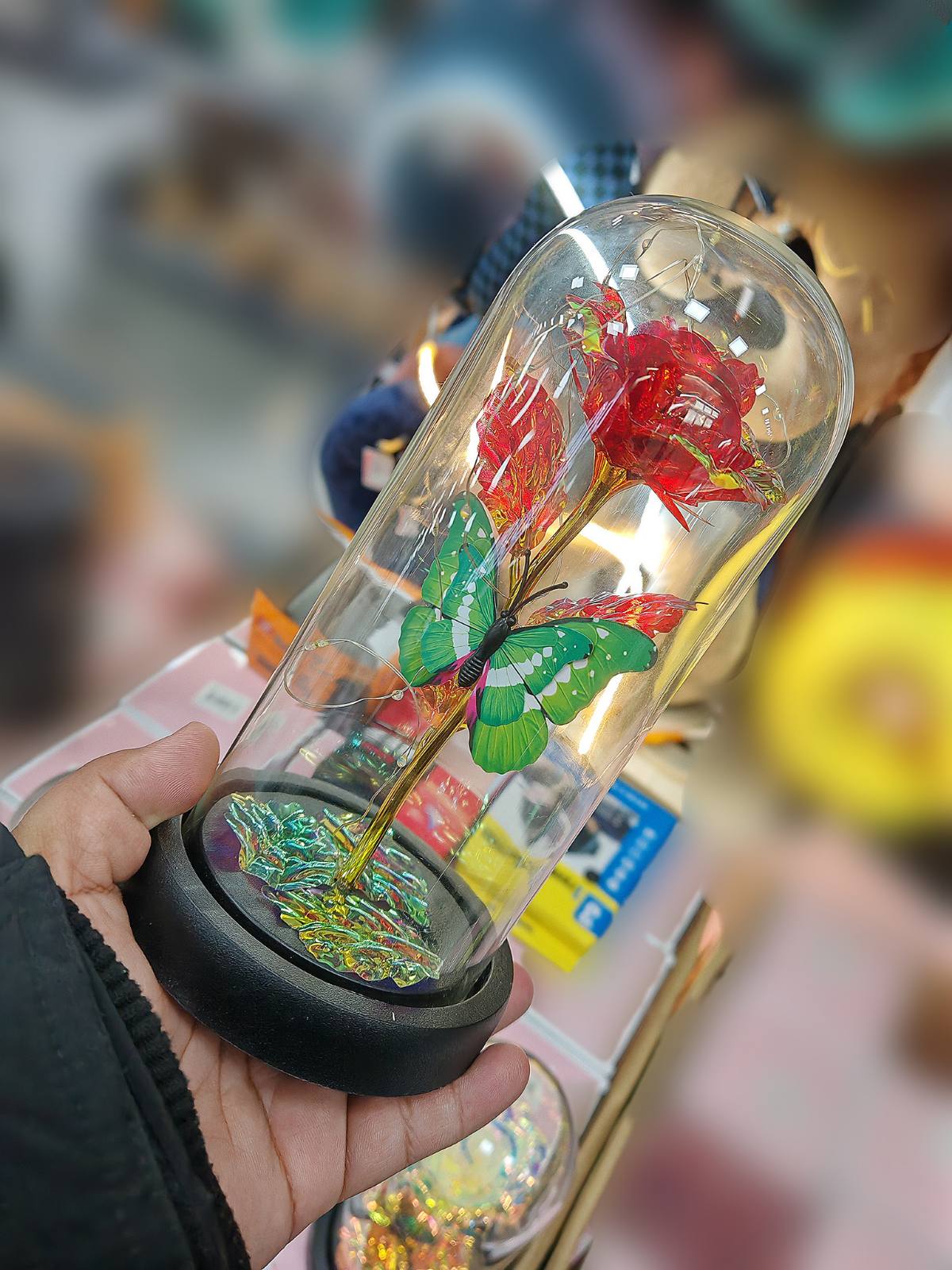 🌹 Crvena večna ruža u staklenom zvonu sa zelenim leptirom – Simbol ljubavi i prirodne harmonije