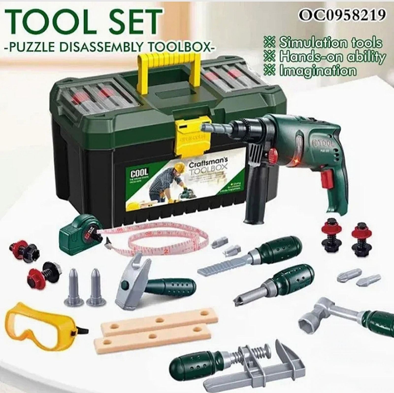 Ovaj komplet sadrži sve što je potrebno za igru, učenje i razvijanje kreativnosti – električnu bušilicu na baterije, čekić, odvijače, klješta, zaštitne naočare, mernu traku i još mnogo dodataka koji imitiraju pravi alat.