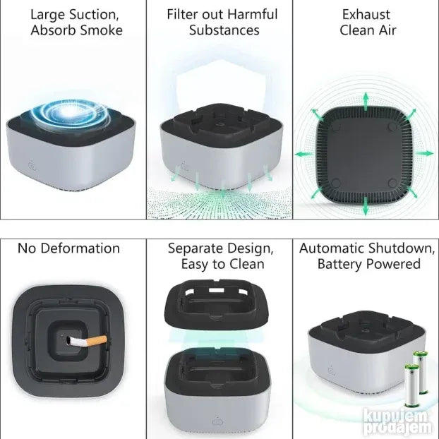 Oslobodite prostor od dima i neprijatnih mirisa – bez ventilatora, buke i punjenja! Ova praktična, prenosiva pepeljara čini vaše okruženje zdravijim uz minimalan trud. Idealno rešenje za dom, kancelariju ili putovanja.