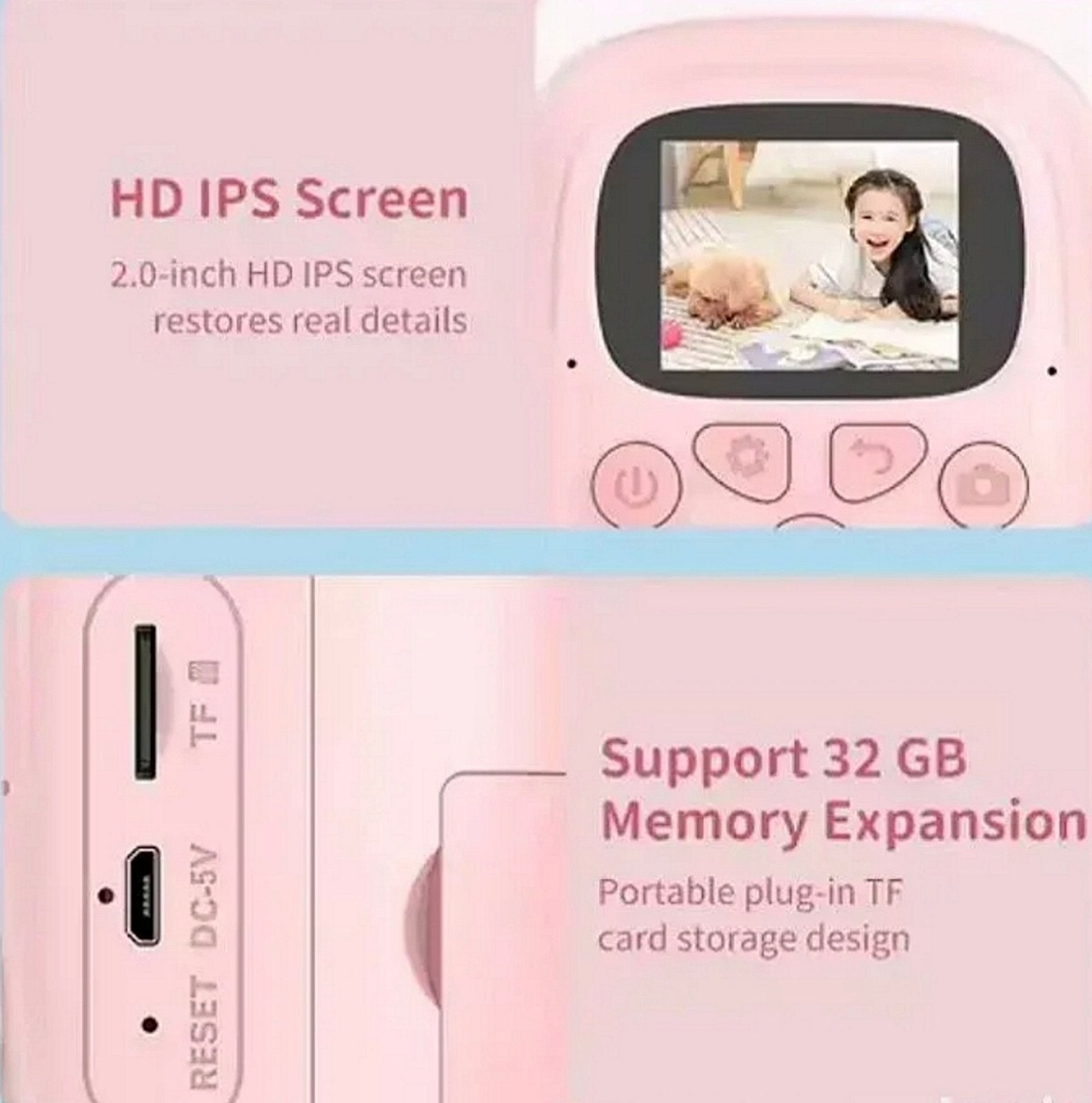 Multifunkcionalna instant kamere za decu: Dečja kamera je prepuna selfija, snimanja videa, tajmera, time-lapsea, 1Ks-8Ks digitalnog zuma, automatskog čuvara ekrana, itd. Pored toga, 20 smešnih okvira, 6 filtera, 5 efekata ogledala,