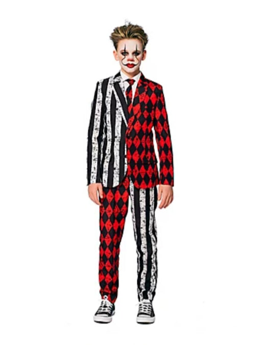 Kostim je upečatljivog dizajna sa crveno-crnim i crno-belim dezenima u stilu harlekina, savršen za Noć veštica, maskenbale i tematske žurke. Kombinacija boja i uzoraka daje strašan, ali atraktivan izgled koji deca obožavaju