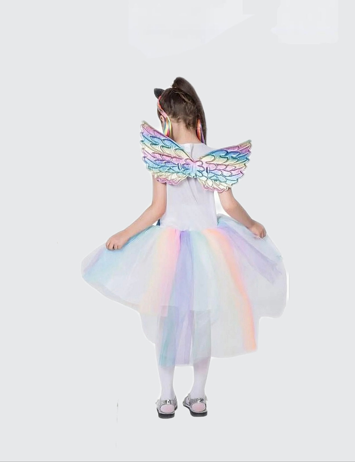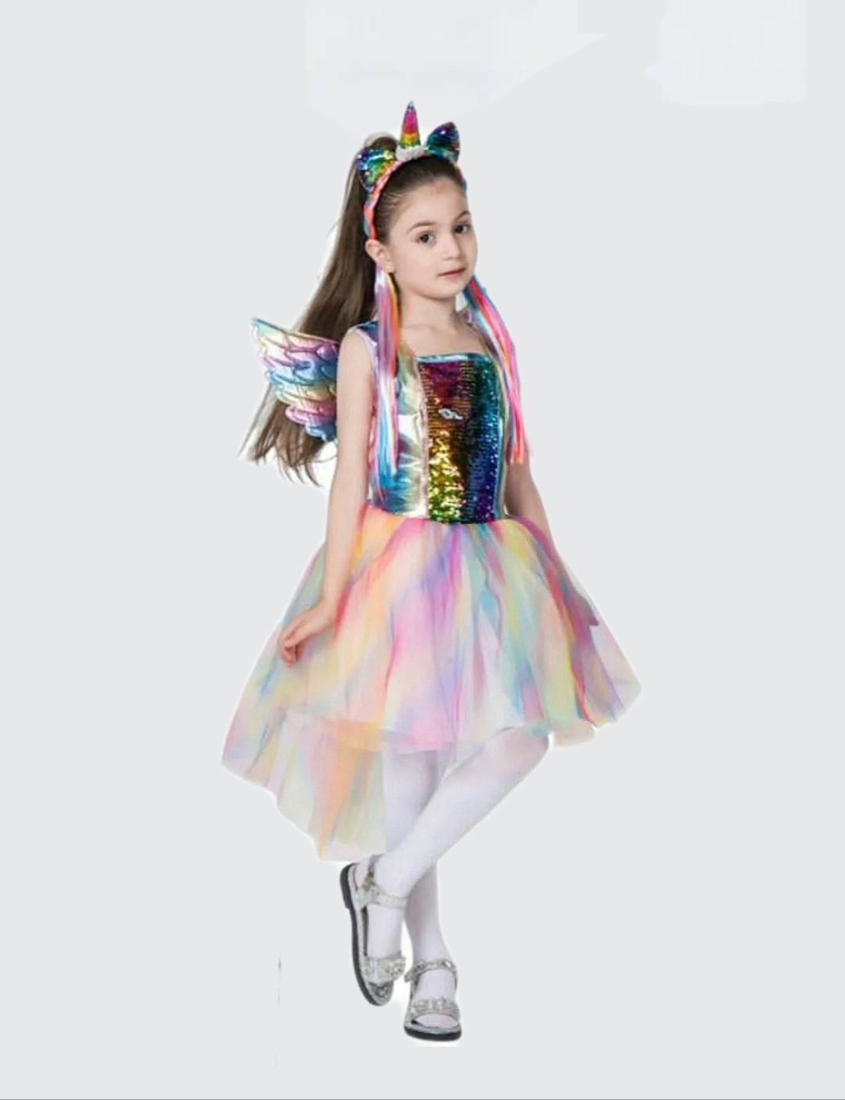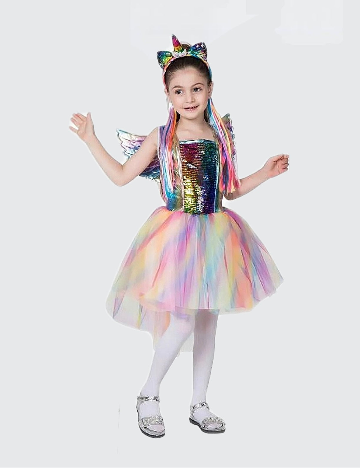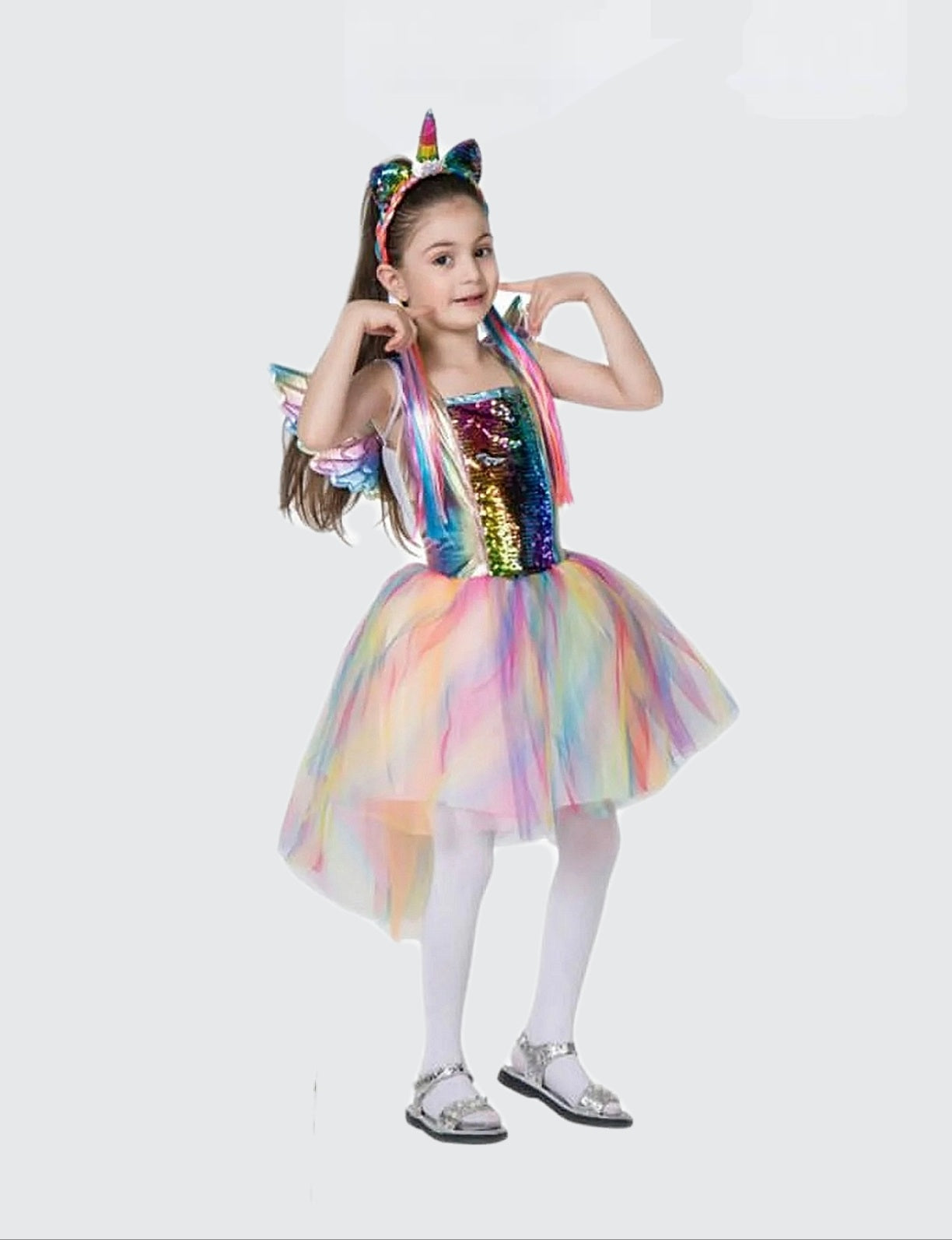 Ovaj kostim je šaroliki i zabavan, savršen za devojčice koje žele da se obuku kao bajkovita stvorenja. gornji deo ima sjajni, šljokasti materijal u raznobojnim tonovima koji reflektuje svetlost.