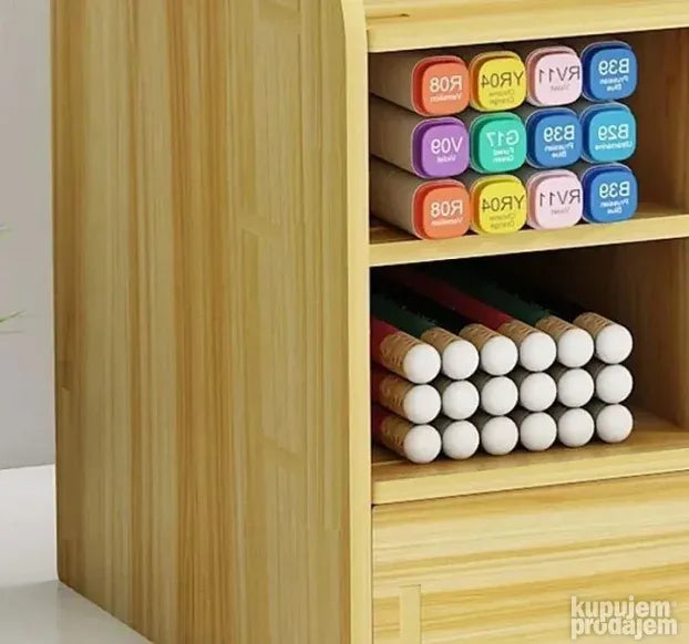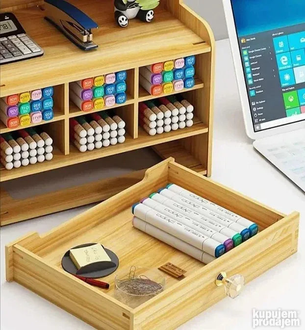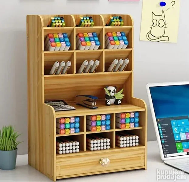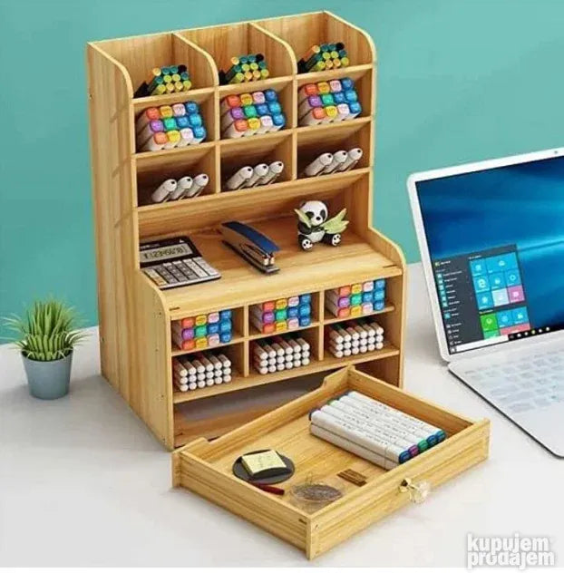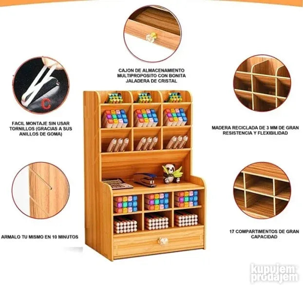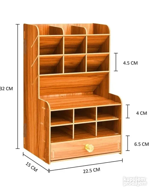 višenamenski organizator i skladište koji će vam omogućiti da odložite i smestite veliki broj predmeta i dodataka u bilo koji od njegovih 15 pregrada. Savremeni dizajn imitacije drveta, čvrst, izdržljiv, otporan na koroziju i ekološki prihvatljiv. Organizator skladišti kancelarijski pribor uredno i raspoređeno. Napravljen je od kompozitne ploče i ima vrhunski izgled.