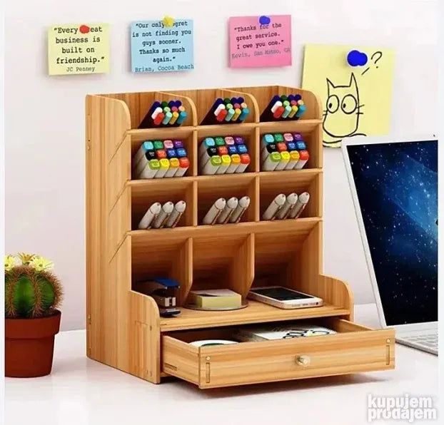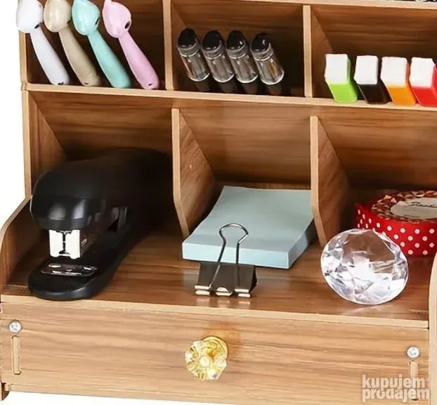 Predstavljamo vam višenamenski stočić-organizer sa 12 prostranih pregrada, idealan za organizaciju i skladištenje raznih predmeta. Sa modernim dizajnom koji imitira drvo, ovaj organizator je robustan, dugotrajan i ekološki prihvatljiv. Savršen je za urednu organizaciju kancelarijskog materijala.