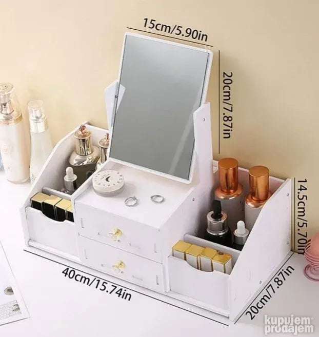 Kozmetički organizer sa ogledalom je nezamenjiv za sve koji cene organizaciju i estetiku u svakodnevnom životu. Ovaj elegantan komad ne samo da će vam olakšati pristup i čuvanje kozmetike, već će i efikasno organizovati vaš nakit, čineći vašu rutinu ulepšavanja jednostavnijom i prijatnijom.